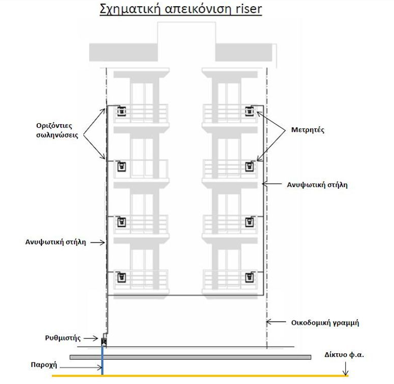 - οριζόντιες σωλήνες (μικρότερης διαμέτρου) που οδεύουν εξωτερικά επί των εξωστών και τροφοδοτούν με φ.α τους μερητές μίας ή περισσοτέρων κατοικιών του ακινήτου.