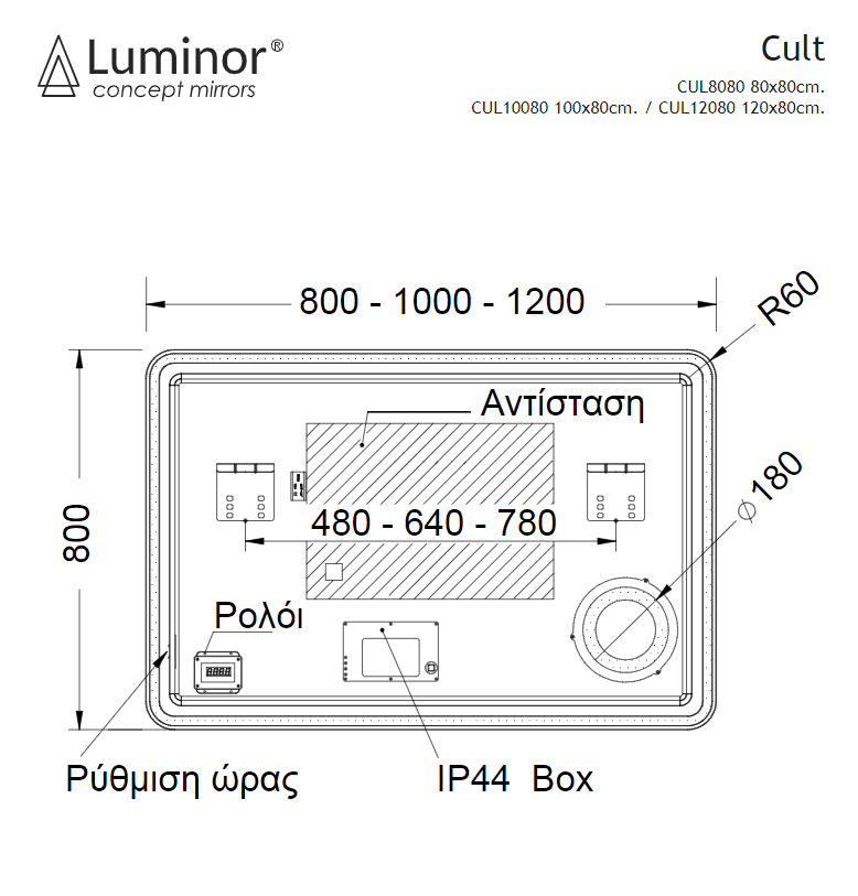 Καθρέπτης CULT, 120x80 εκ. φωτιζόμενος LED, με ενσωματωμένο μεγεθυντικό x3 καθρέπτη μακιγιάζ Φ18 και ψηφιακό ρολόι, LUMINOR