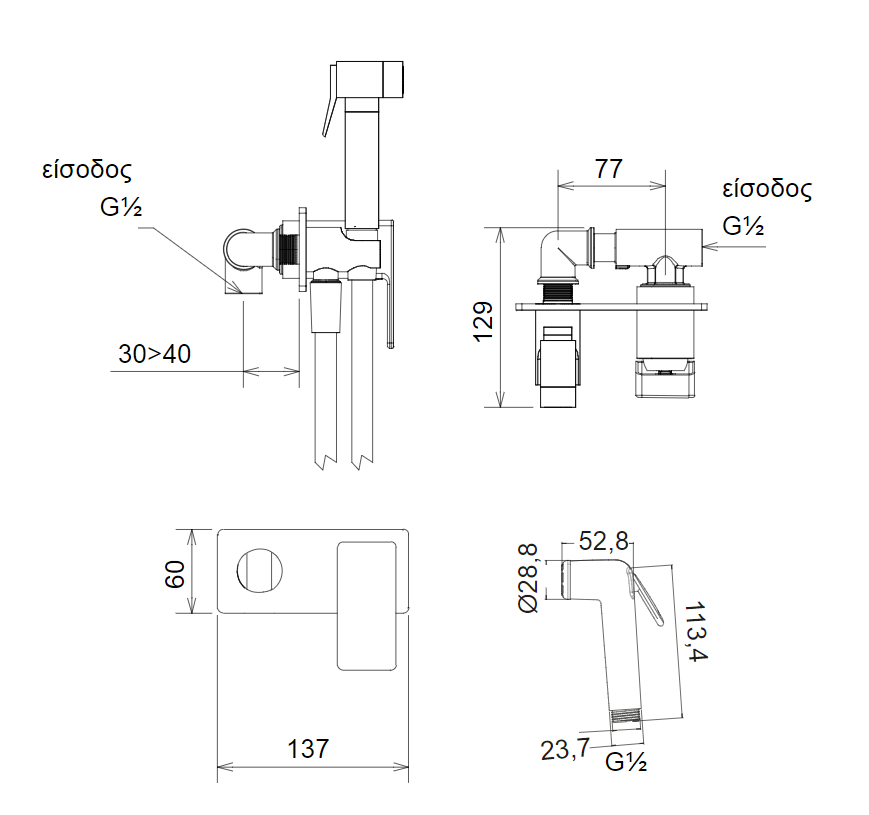 Τοποθέτηση: Δίπλα στη λεκάνη (απαιτείται επιπλέον παροχή κρύου & ζεστού νερού). Δε χρειάζεται υδραυλική διασύνδεση (περιλαμβάνει γέφυρα 80mm μίκτη - παροχής).